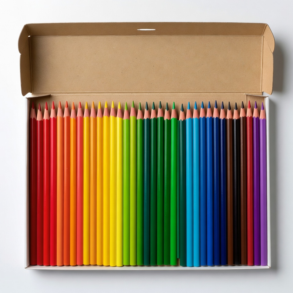 An open brown cardboard box contains a full set of colorful crayons arranged in rows. The crayons display a rainbow spectrum from red to purple, standing upright with sharpened tips. The box is viewed from above on a white background.