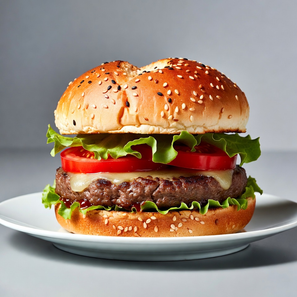 A juicy cheeseburger sits on a white plate with a sesame seed bun. Fresh lettuce and tomato slices top the melted cheese on the beef patty. The burger is centered against a light gray background.