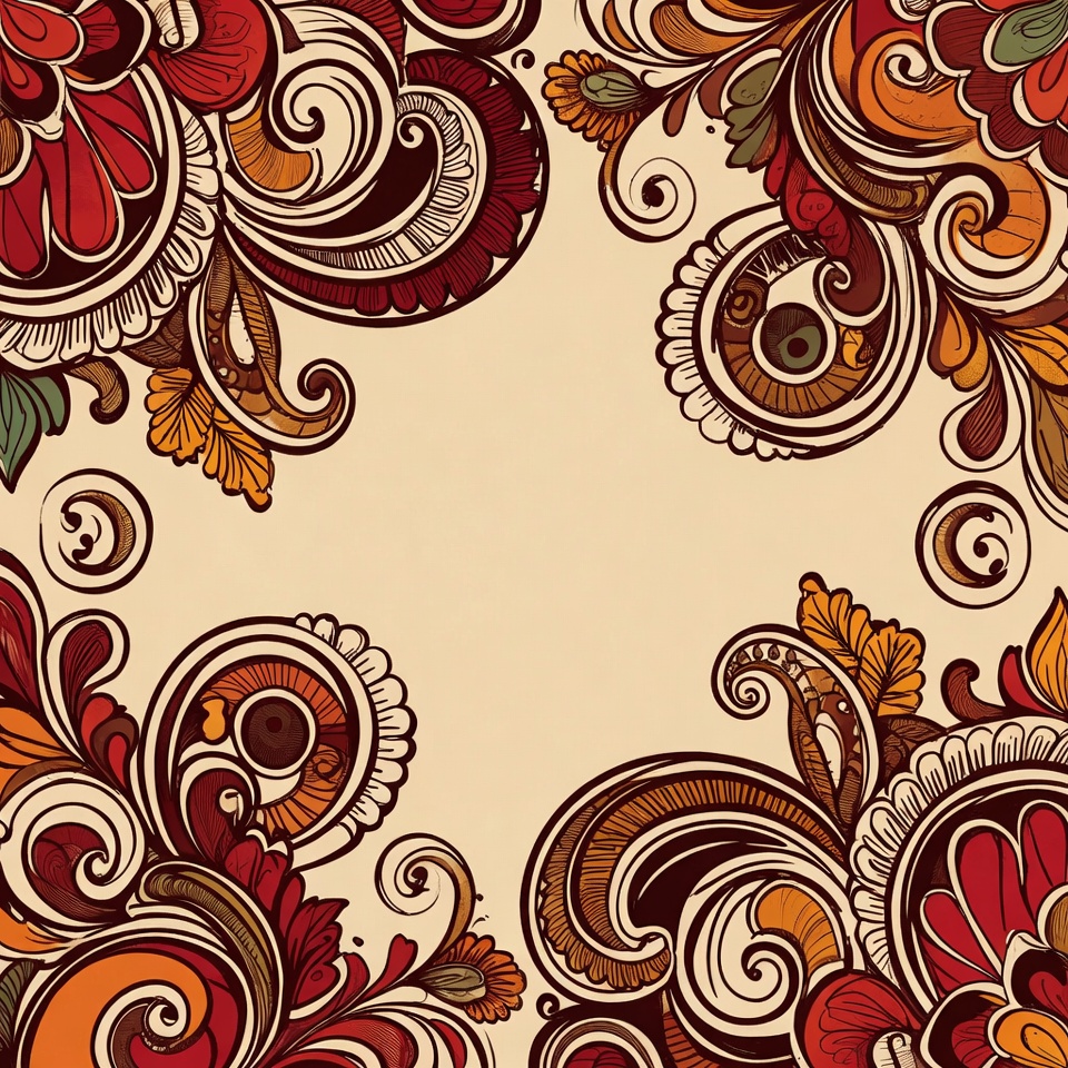 An intricate hand-drawn floral border in red, orange, and green tones frames the corners of a light beige background. Swirling vines, leaves, and blooming flowers create a symmetrical ornamental design. The illustration features detailed line art with vibrant autumnal colors.