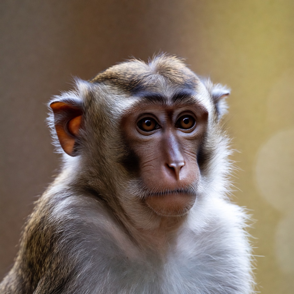 animal, ape, big eyes, brown fur, closeup, ears, fur, isolated background, long-tailed macaque, mammal, monkey, muzzle, nature, portrait, primate, simian, staring, whiskers, wildlife, macaque