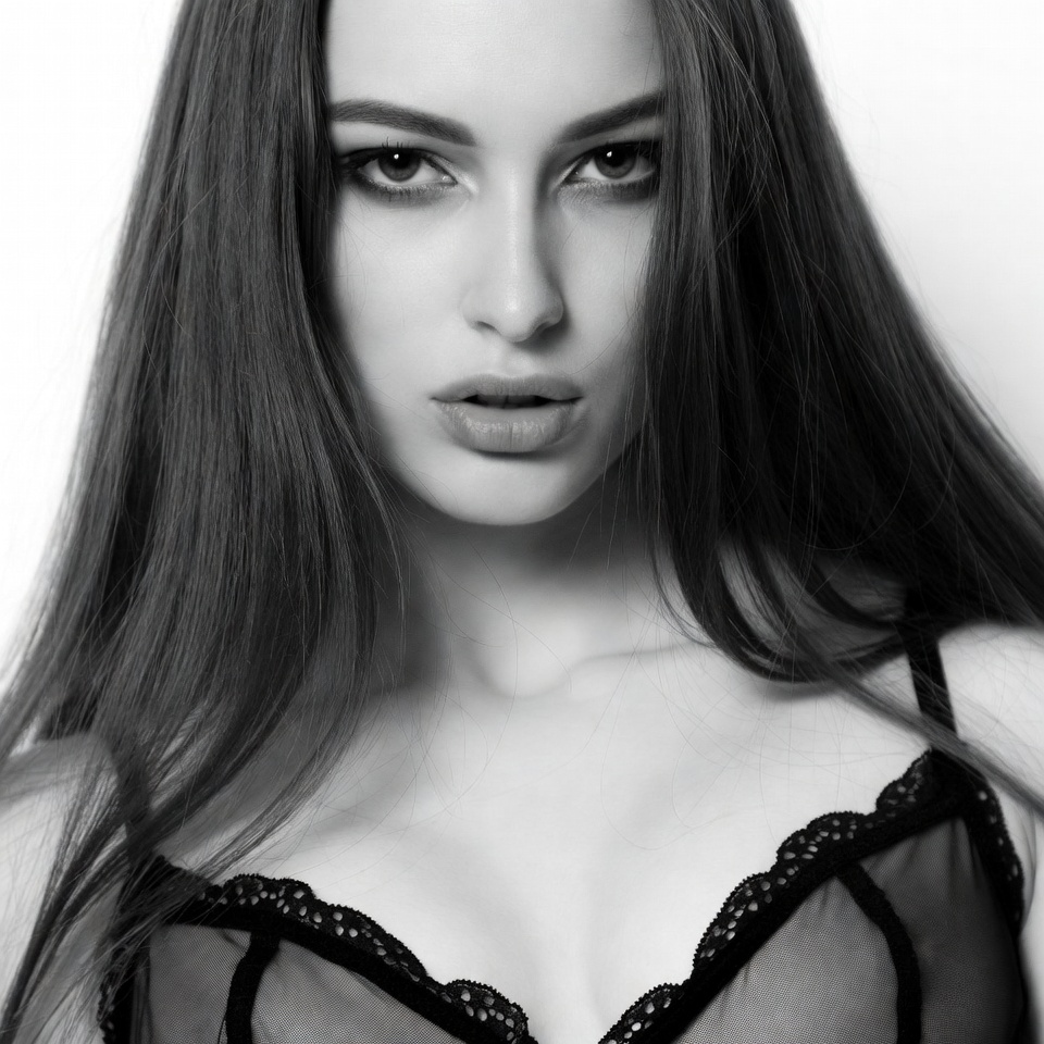 White, beautiful, black and white, black lace bra, brown hair, close-up, female, full lips, headshot, intense gaze, lace trim, lingerie, long hair, monochrome, portrait, seductive look, sheer fabric, smoky eyes, straight hair, studio shot, young, woman