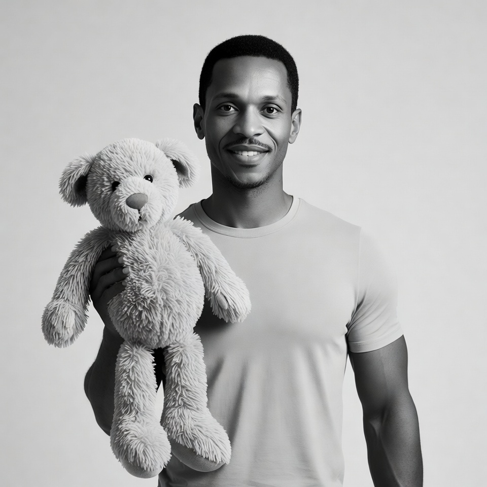 A smiling African-American man with short hair holds a fluffy teddy bear in his arms. He wears a plain t-shirt and stands against a white background. The image is in black and white.