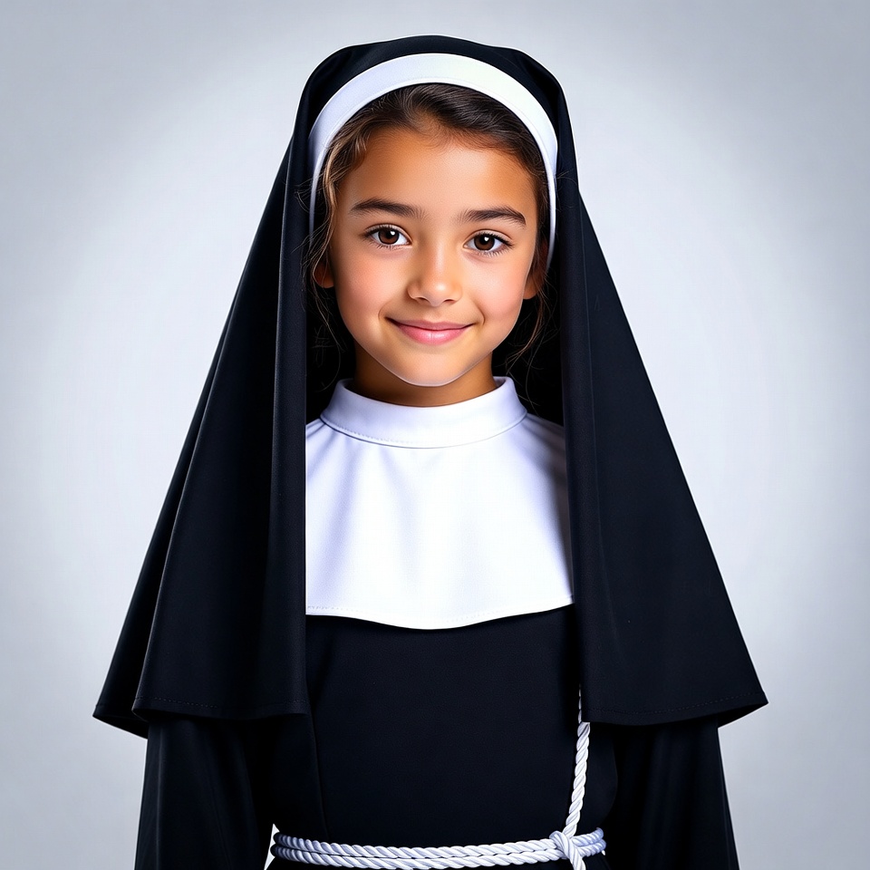 Catholic nun, Multiracial, black veil, brown eyes, child nun, costume, dark hair, female, front view, gray background, isolated background, nun, nun habit, portrait, religious clothing, rosary belt, smiling girl, tan skin, white coif, young girl, girl