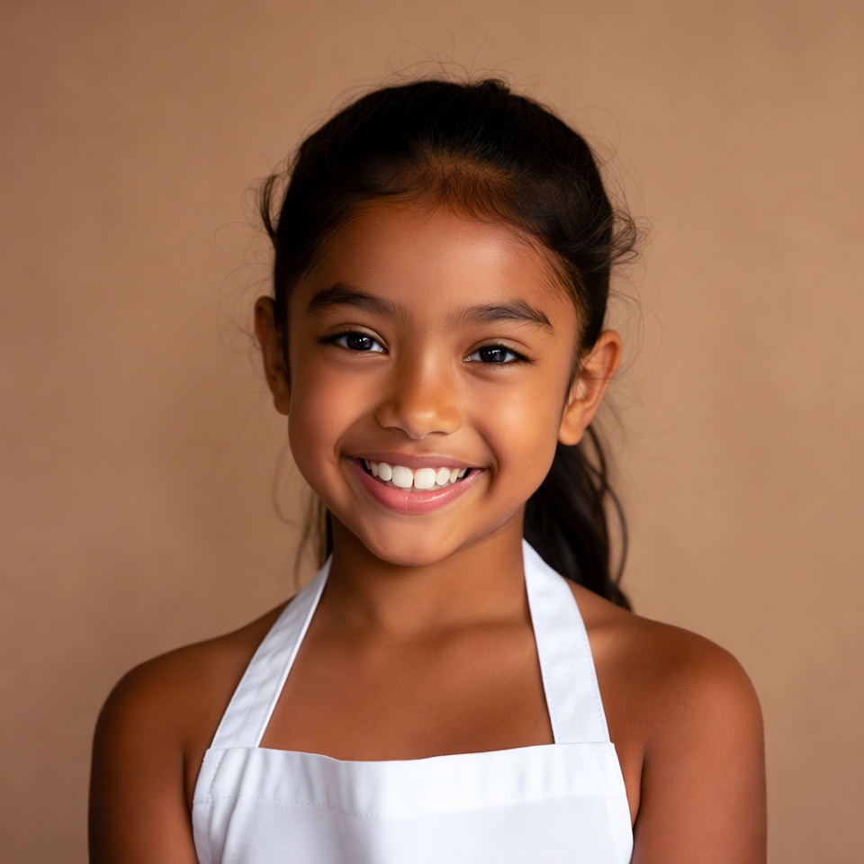 A young Asian girl with dark hair tied in a ponytail smiles happily at the camera. She wears a white apron over her clothing and stands against a beige background. Her expressive eyes and bright smile are prominently featured in the close-up portrait.