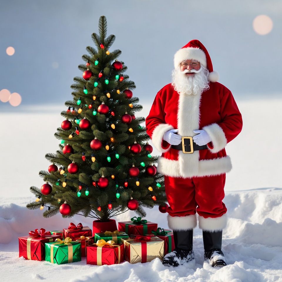 Santa Claus in a red suit with white trim stands smiling beside a decorated Christmas tree on a snowy ground. Colorful ornaments and lights adorn the evergreen tree, while wrapped presents in red, green, and gold sit in the snow around its base. A bokeh background with blue tones and light spots enhances the festive holiday scene.