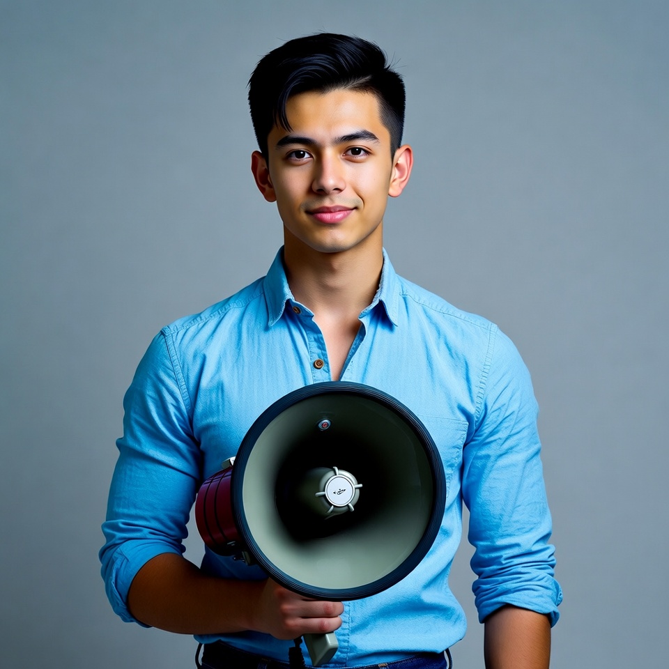 A young Asian man with short black hair and smiling expression holds a large blue megaphone in both hands. He wears a light blue button-up shirt and dark pants, standing against a plain gray background. His pose is confident and front-facing.
