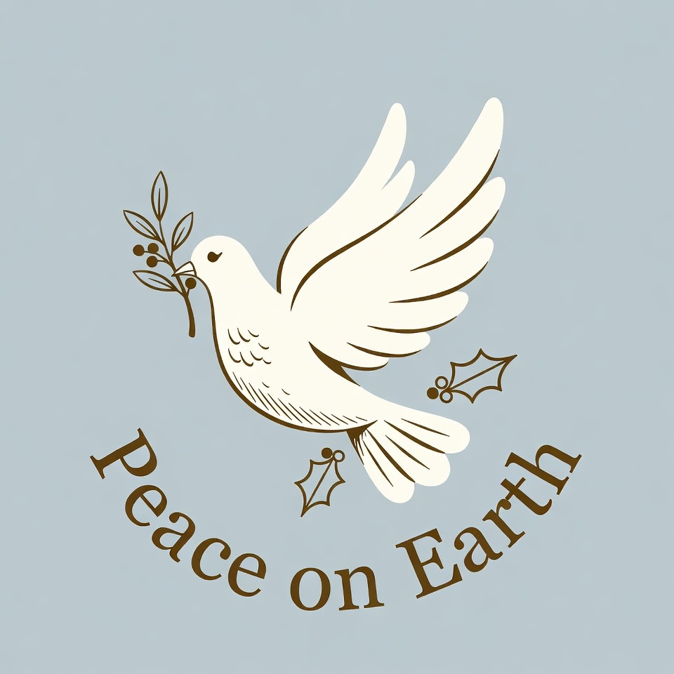 A white dove illustration holds an olive branch in its beak and is surrounded by holly leaves on a light blue background. The text 'Peace on Earth' is arched above the dove in elegant brown lettering. The design features clean line art with subtle shading.