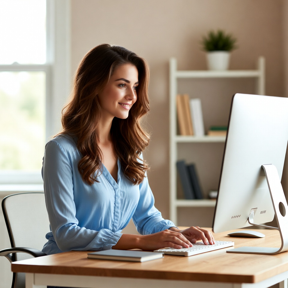 A woman with long brown wavy hair sits at a wooden desk typing on a keyboard in front of a large white iMac monitor. She wears a light blue button-up blouse and smiles slightly while working in a bright home office with bookshelves, plants, and a window nearby. Notebooks and books are stacked on the desk and shelves.