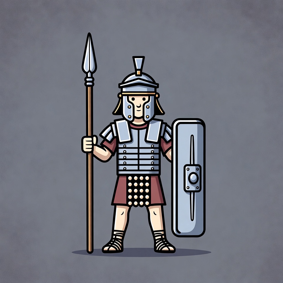 A cartoon illustration of a Roman soldier standing on a gray background. He wears a plumed helmet, segmented armor, red skirt, and sandals while holding a tall spear in his right hand and a large rectangular shield in his left. His expression is neutral and he stands in a ready pose.