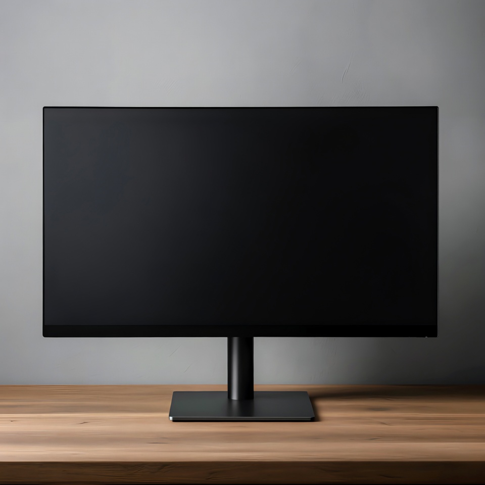 A sleek black computer monitor with a thin bezel stands on a wooden desk. It features a slim black stand and a blank black screen. The setup is placed against a light gray background.