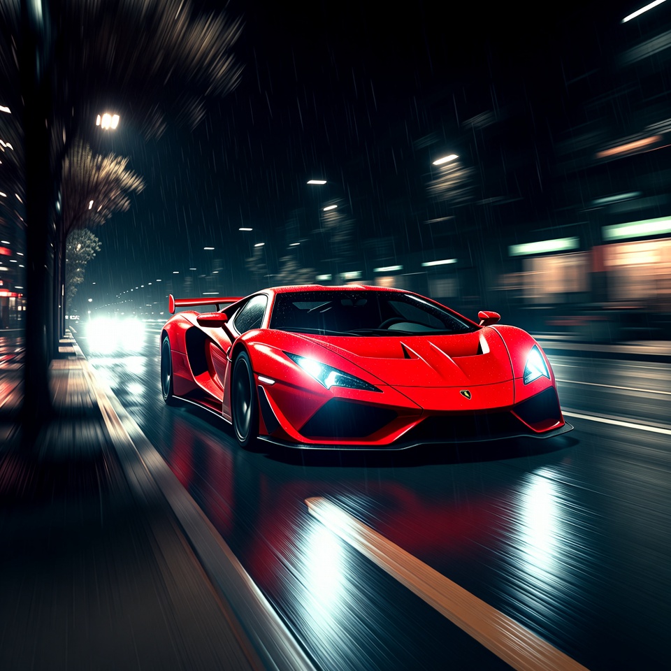 asphalt road, automotive, blurred background, car lights, city night, driving rain, dynamic motion, fast car, headlights, high speed, hypercar, luxury car, motion blur, neon lights, night street, palm trees, rain splashes, rainy night, red car, speed, sports car, street lights, supercar, urban street, wet road, red supercar