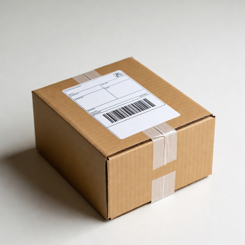 address label, barcode, brown box, cardboard box, clear tape, corrugated cardboard, delivery box, e-commerce box, isolated background, mail package, package, postal box, sealed box, shipping label, shipping box