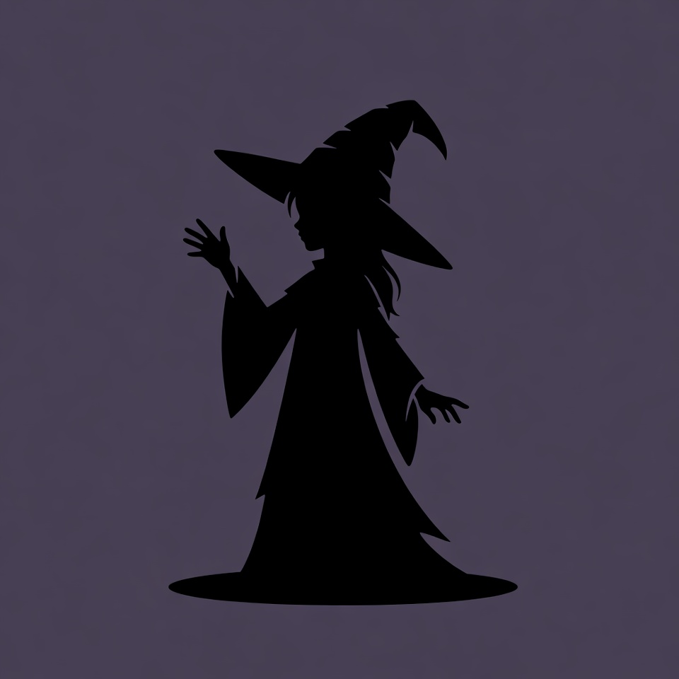 A black silhouette illustration of a young girl in a pointed witch hat and flowing dress stands on a purple background. She has long hair and raises both hands as if casting a spell. The image features a simple, cartoonish style with sharp outlines.