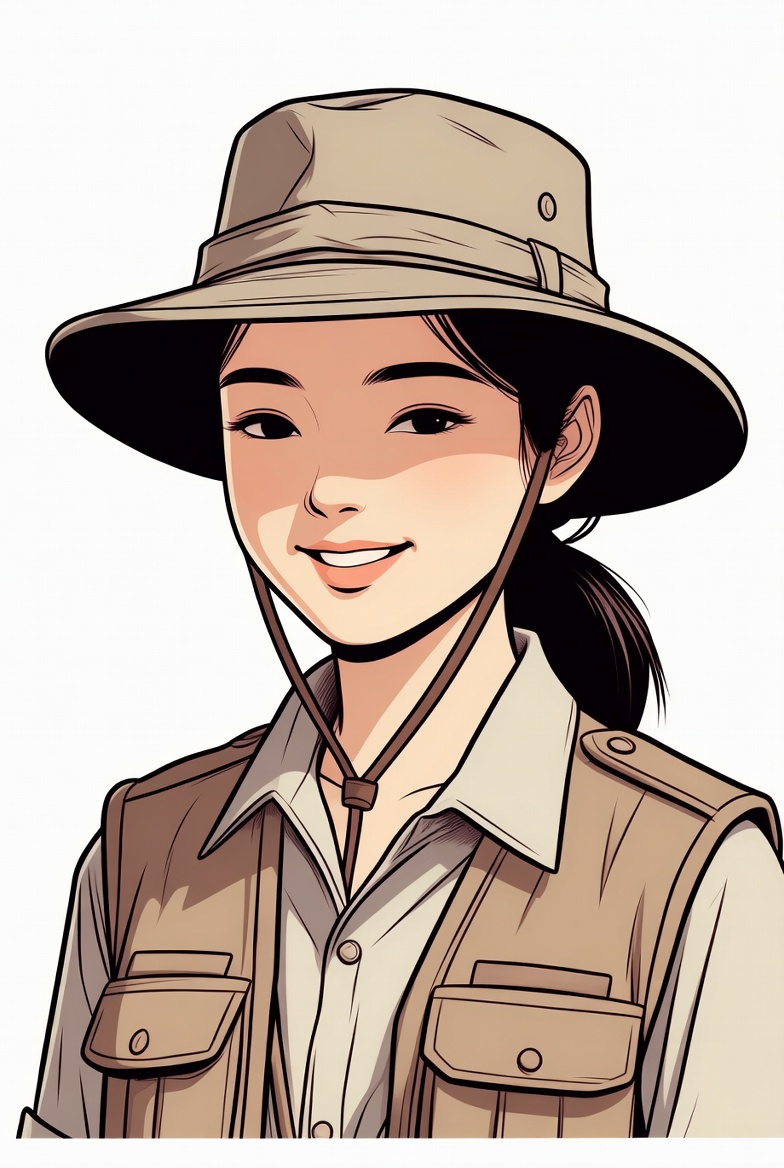 An illustrated Asian woman with a friendly smile wears a wide-brimmed khaki safari hat and ponytail. She is dressed in a khaki vest over a white collared shirt. The portrait is on an isolated white background.