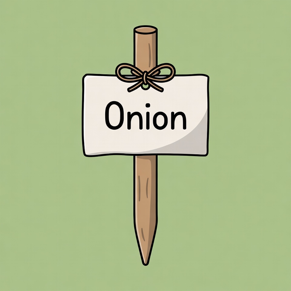 A simple cartoon illustration shows a wooden stake with a white rectangular sign labeled 'Onion' in black text. The sign is tied with a brown string bow and mounted on a pointed brown stick. The entire image is set against a solid light green background.