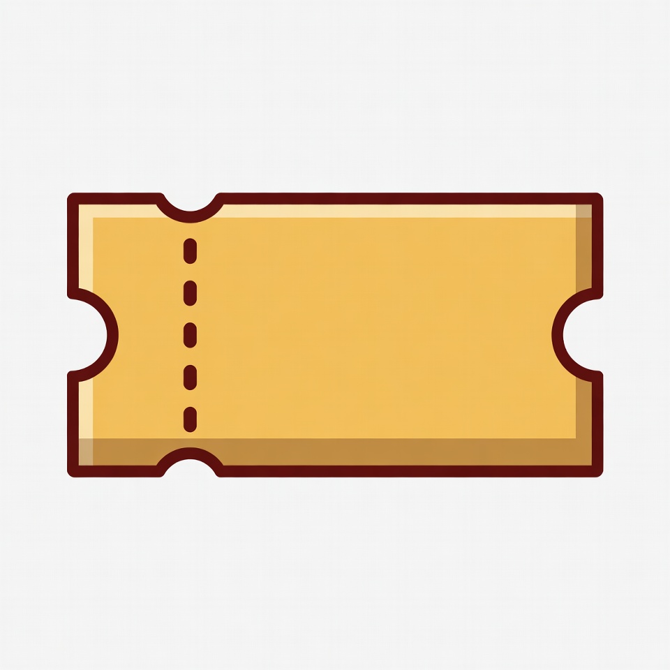 A simple yellow ticket illustration with perforated edges on both sides. It features a dashed line down the center and a flat design with a red outline. The ticket is isolated on a white background.