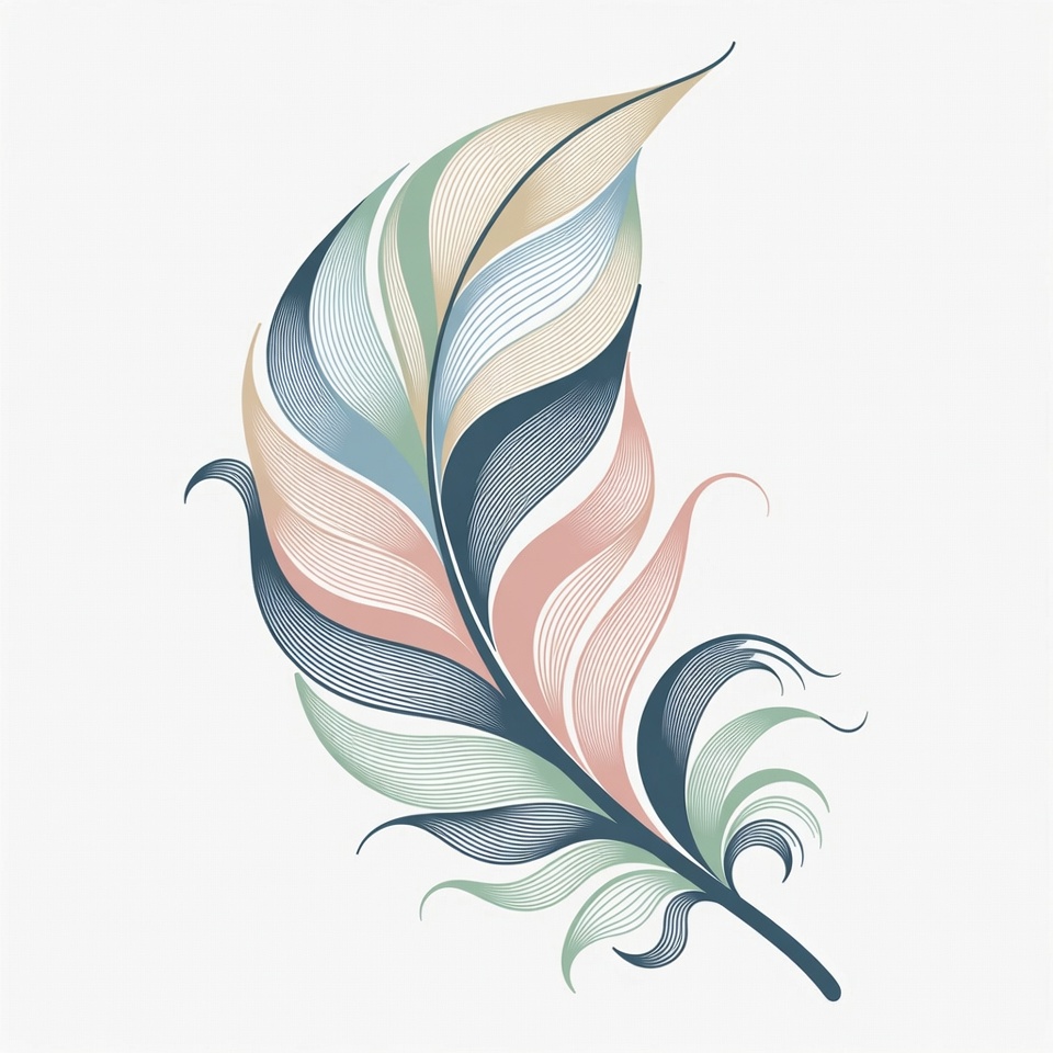 A detailed illustration of a single feather with smooth, flowing lines in shades of blue, green, pink, and beige. The feather features intricate layered barbs and a curved quill on a white background. It has a soft, watercolor-like style with subtle gradients.
