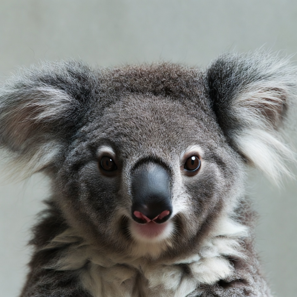 A fluffy gray koala with large round eyes stares directly at the camera. Its black nose and pink tongue are visible in the detailed close-up. The koala is centered against a plain light gray background.