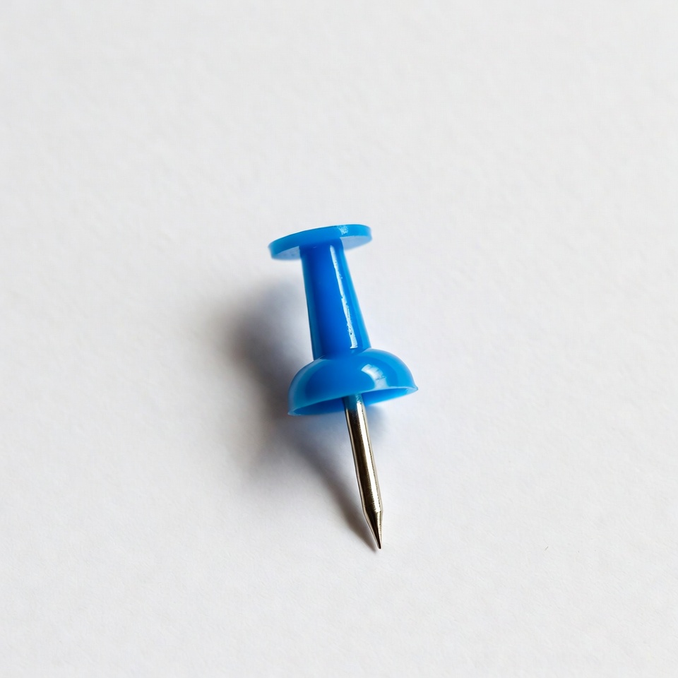 A bright blue push pin with a plastic head and metal pin is placed on a plain white surface. The pin stands upright, showcasing its rounded blue top and sharp silver point. It is isolated against the white background.