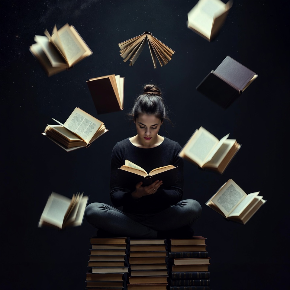 A young woman with dark hair in a bun sits cross-legged on a stack of books, reading an open book intently. Numerous books float and spin around her against a dark starry background. She wears a black sweater and pants, surrounded by open and closed books in various sizes.