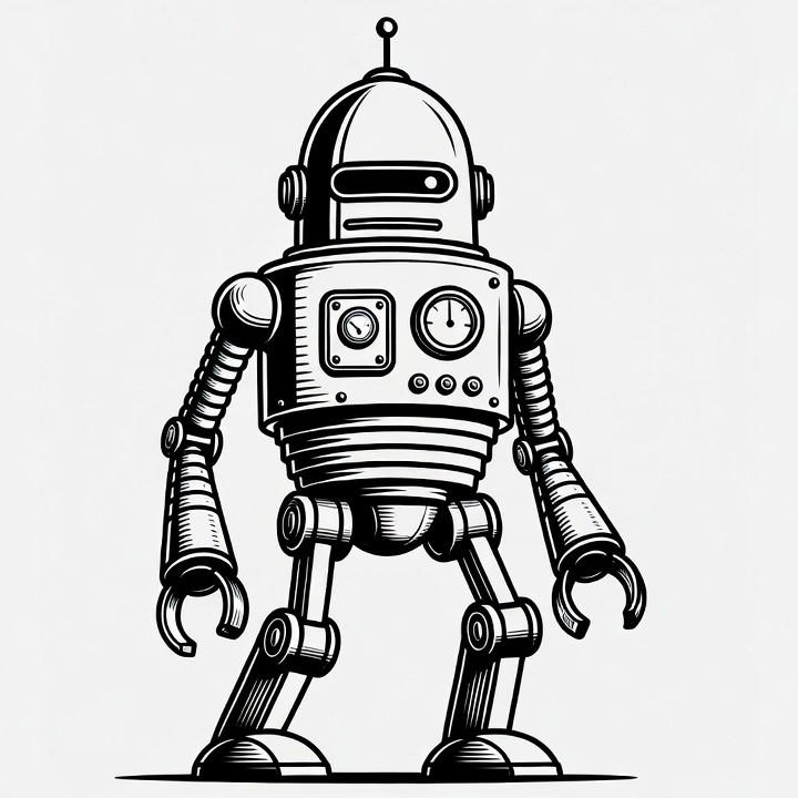 antenna, black and white, claw hands, clipart, clock, gauges, humanoid robot, illustration, isolated background, line art, mechanical robot, retro robot, riveted panels, robot design, robot illustration, sci-fi robot, standing robot, vintage robot, visor eyes, robot