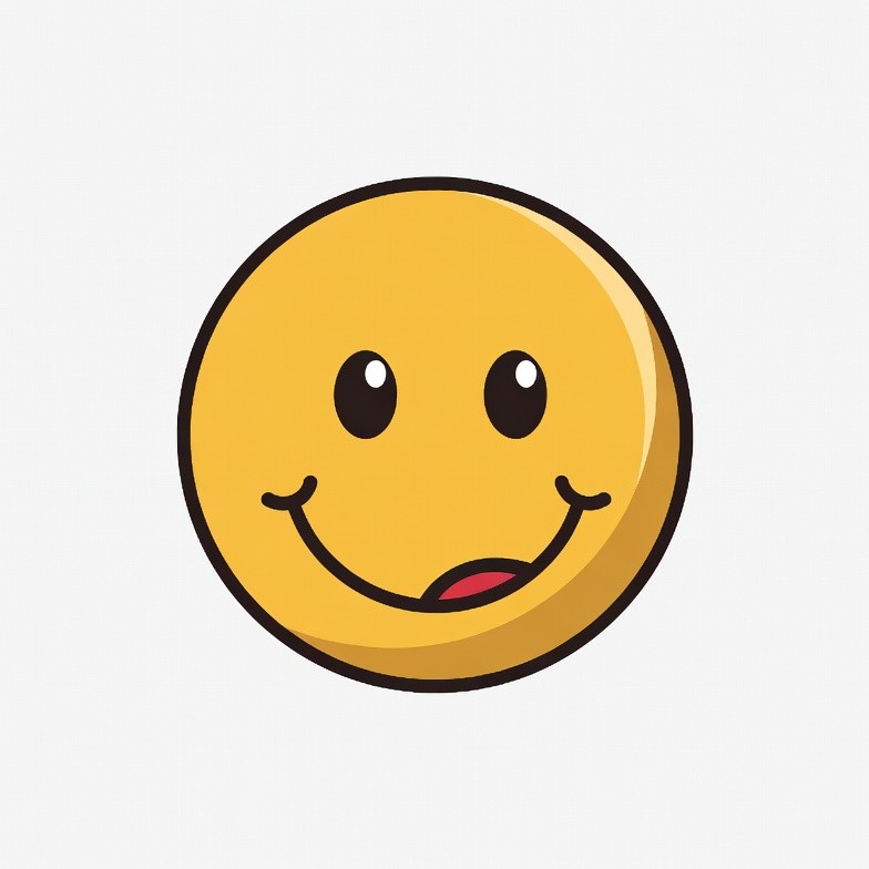 A yellow cartoon smiley face with big round eyes and a wide grin sticks out a red tongue. It features thick black outlines and a glossy appearance on a white background. The illustration is simple and playful.