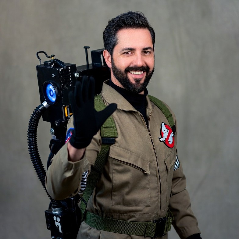 A man with dark hair and a beard wears a full Ghostbusters jumpsuit and proton pack on a gray background. He smiles while raising his right hand in a black glove. The iconic Ghostbusters logo is visible on his chest and shoulder.
