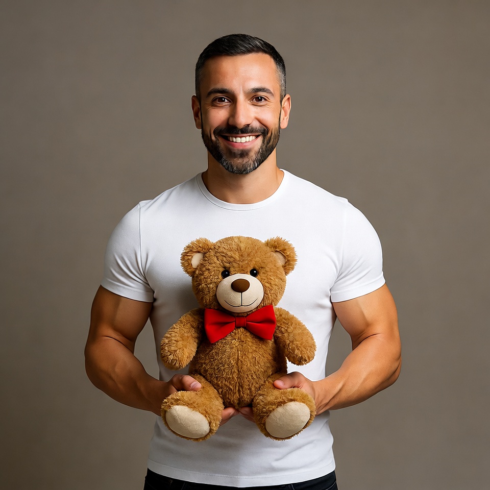A muscular man with short dark hair and a beard smiles while holding a brown teddy bear with a red bow tie. He wears a white t-shirt and dark pants against a plain gray background. The teddy bear has a cute face and is clutched in his hands.
