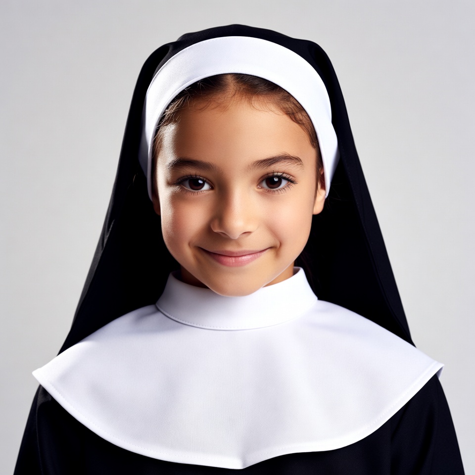 A young girl with a warm smile wears a traditional black nun's habit with a white coif and collar. She has dark brown skin, expressive brown eyes, and curly dark hair partially visible under the headpiece. She stands against a plain gray background.