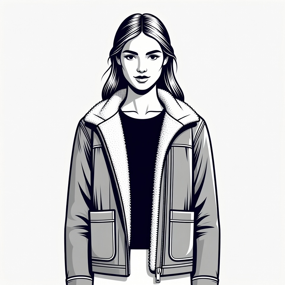black top, clothing, detailed illustration, fashion, female, front view, fur jacket, illustration, isolated background, line art, long hair, outerwear, portrait, shearling collar, stylish woman, vector art, wavy hair, winter jacket, young woman, woman