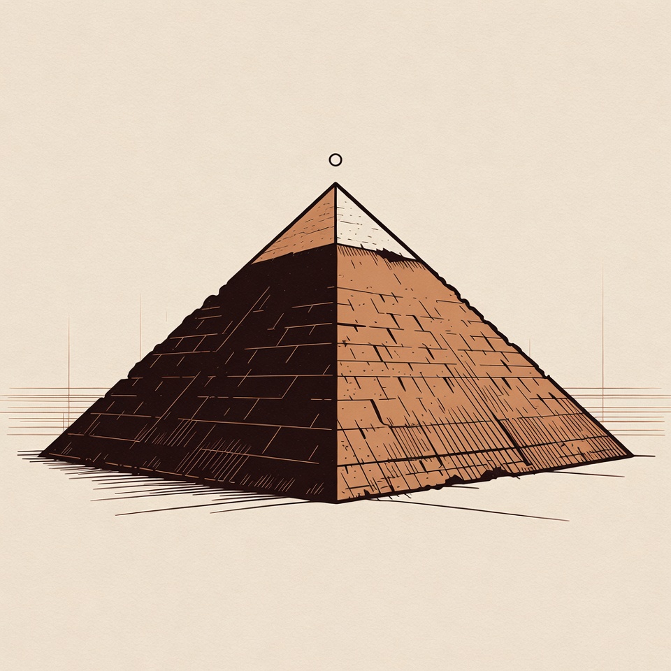 A detailed line drawing illustration of an ancient Egyptian pyramid with a beige stone texture. The pyramid features layered stone blocks in shades of brown and tan, topped with a small orb. It is centered on a light beige background with subtle shadows.
