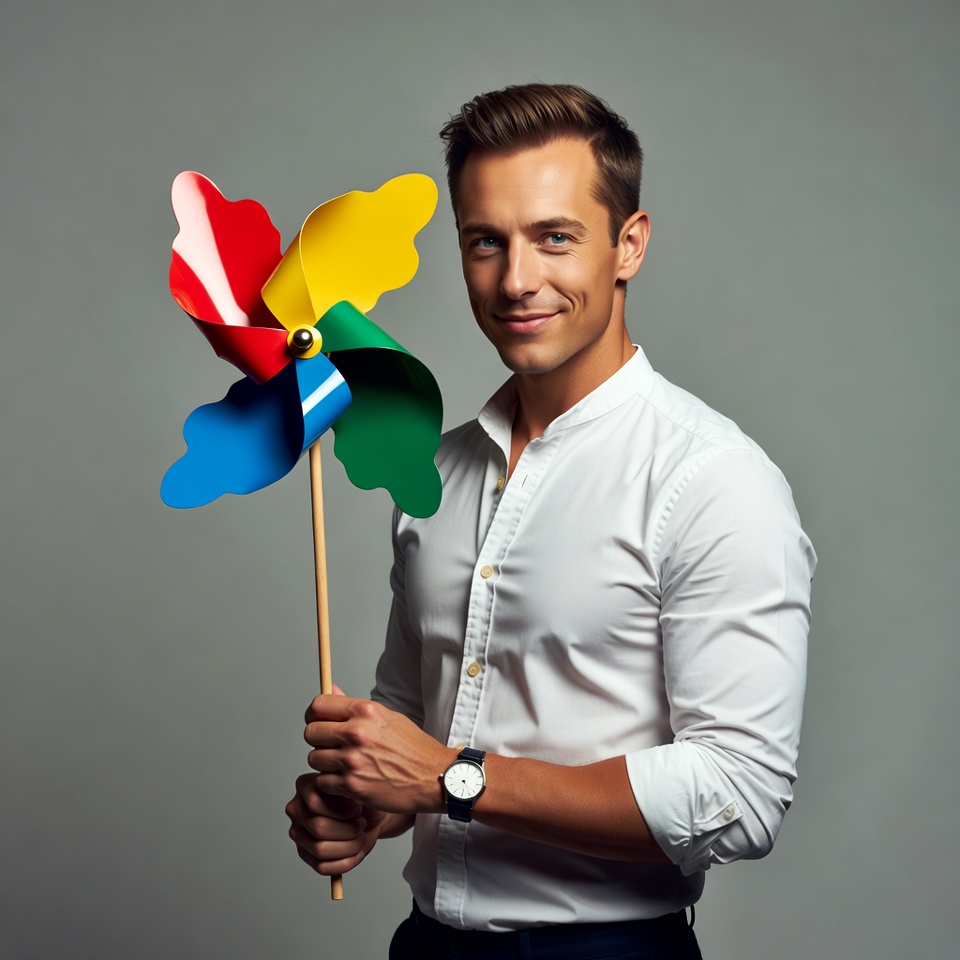 A young man with short brown hair smiles while holding a large colorful pinwheel with red, yellow, blue, and green blades. He wears a white button-up shirt with rolled sleeves, dark pants, and a wristwatch. The image is set against a plain gray background.