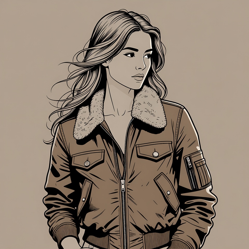 White, aviator jacket, beige tones, blonde hair, bomber jacket, brown jacket, clothing, drawing, fashion, female, fur collar, illustration, isolated background, jacket zipper, line art, long hair, pocket, portrait, sketch, stylish, wavy hair, windblown hair, woman