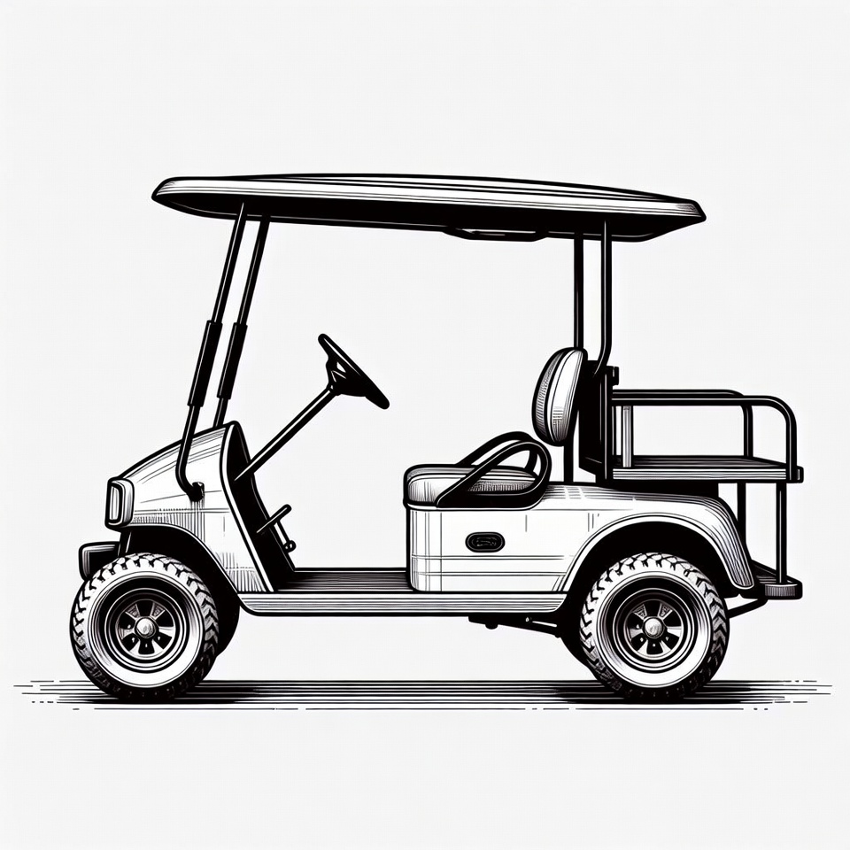 black and white, canopy, cart, clipart, compact cart, detailed, golf, illustration, ink drawing, isolated background, line art, roll bars, seats, side view, sketch, steering wheel, tires, utility vehicle, vehicle, wheels, golf cart