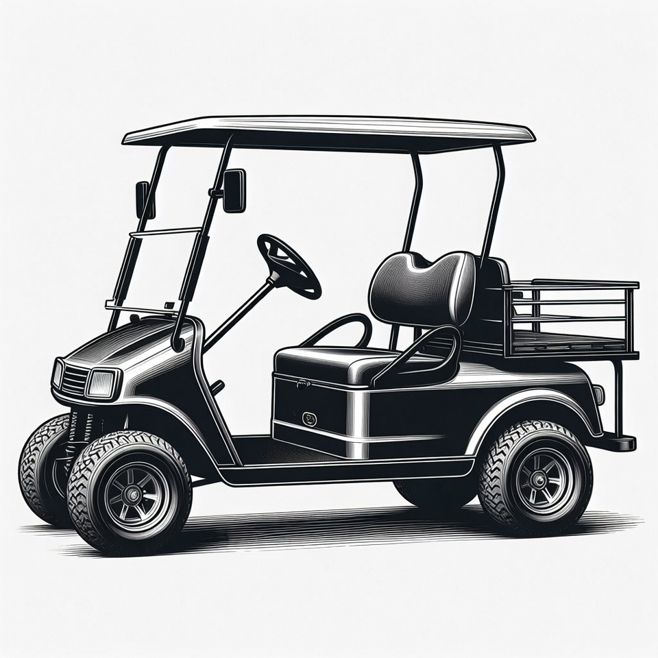 black golf cart, bucket seats, canopy top, cargo bed, cart illustration, golf vehicle, headlights, isolated background, line art, off-road tires, side view, steering wheel, utility cart, vector graphic, golf cart