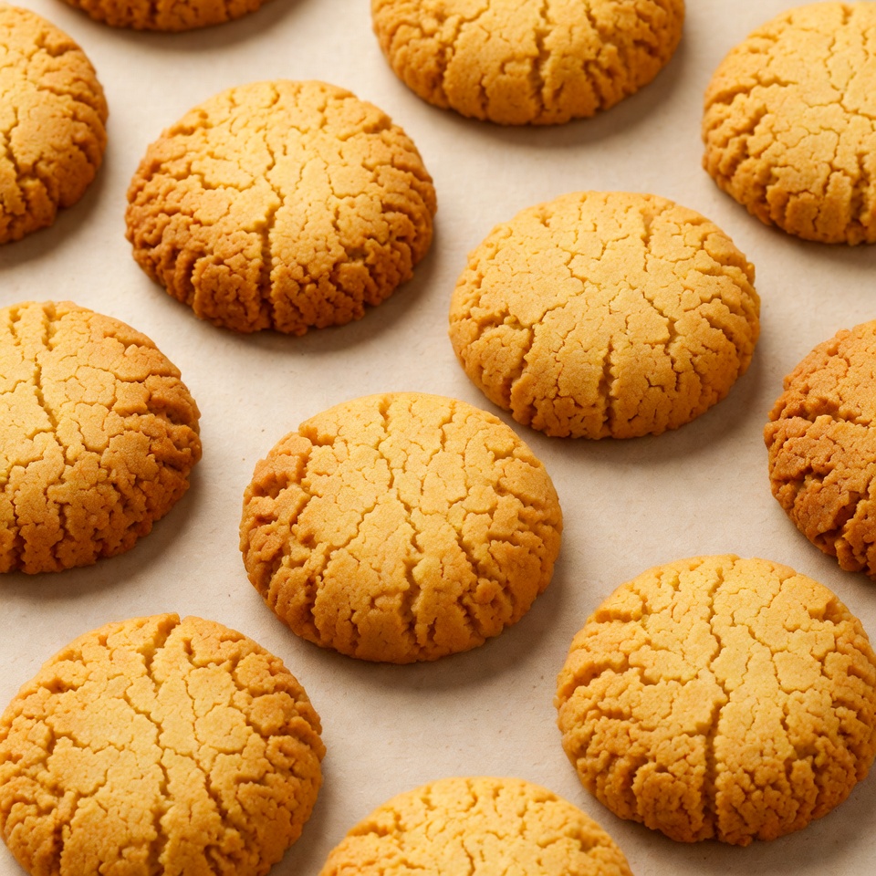Multiple golden shortbread cookies with cracked, crumbly surfaces are arranged in a grid pattern. They sit on a textured white paper background. The cookies have a uniform round shape and rich buttery color.