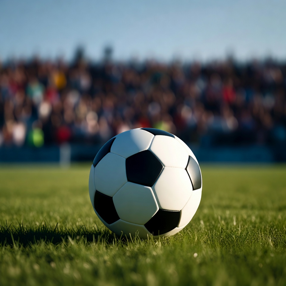 A white and black soccer ball sits on a vibrant green grass field under a clear blue sky. In the blurred background, a large crowd of spectators fills the stadium stands. The focus is sharply on the ball with shallow depth of field.