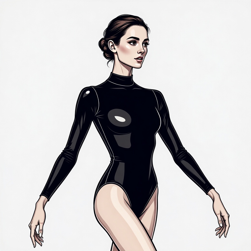 A detailed digital illustration of a woman with brunette hair in an elegant updo stands in a three-quarter view. She wears a shiny black latex bodysuit with a high neck, long sleeves, and high-cut legs that accentuate her figure. Her pose is graceful with arms extended, set against a plain white background.