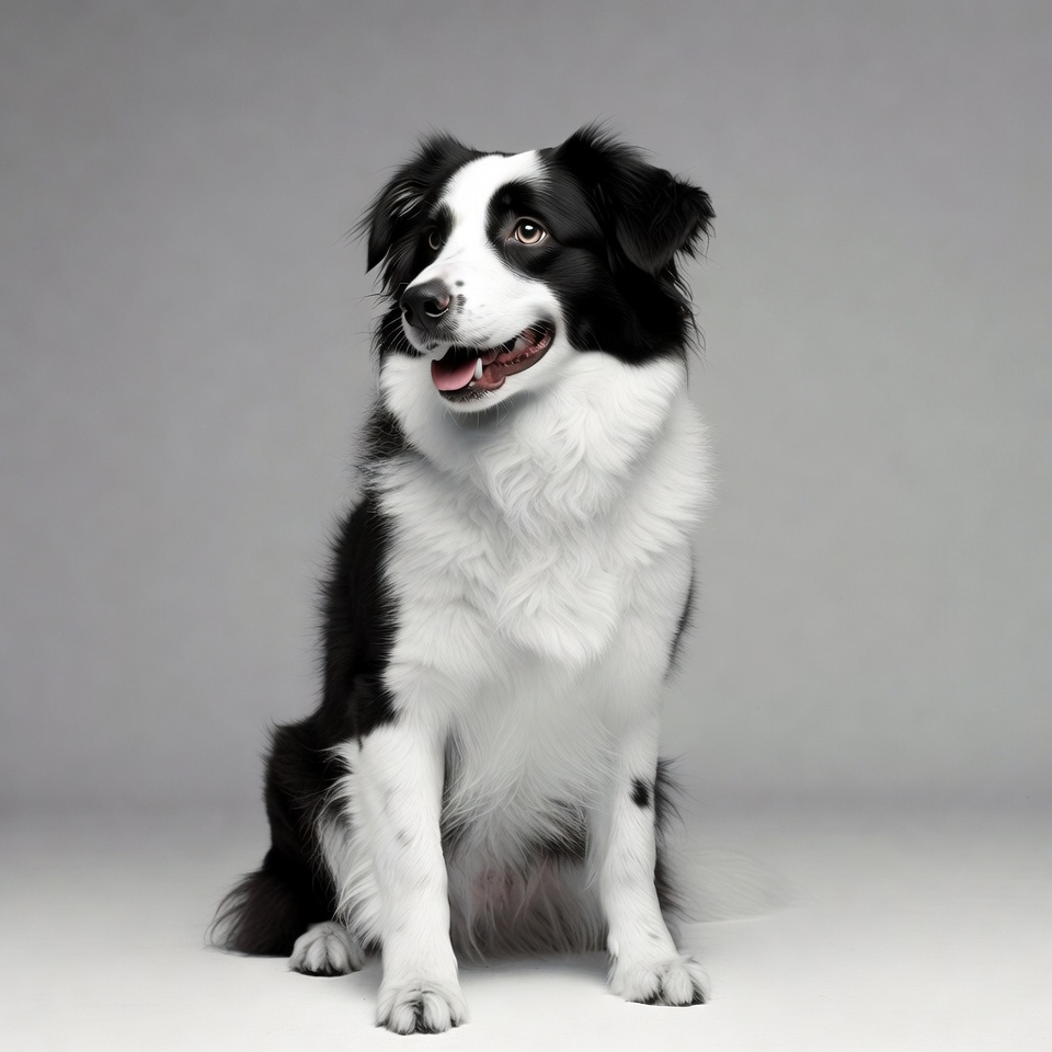 A black and white Border Collie dog sits attentively on a plain gray background. The dog has fluffy fur, bright eyes, and a smiling expression with its tongue slightly out. It faces slightly to the side with perked ears.