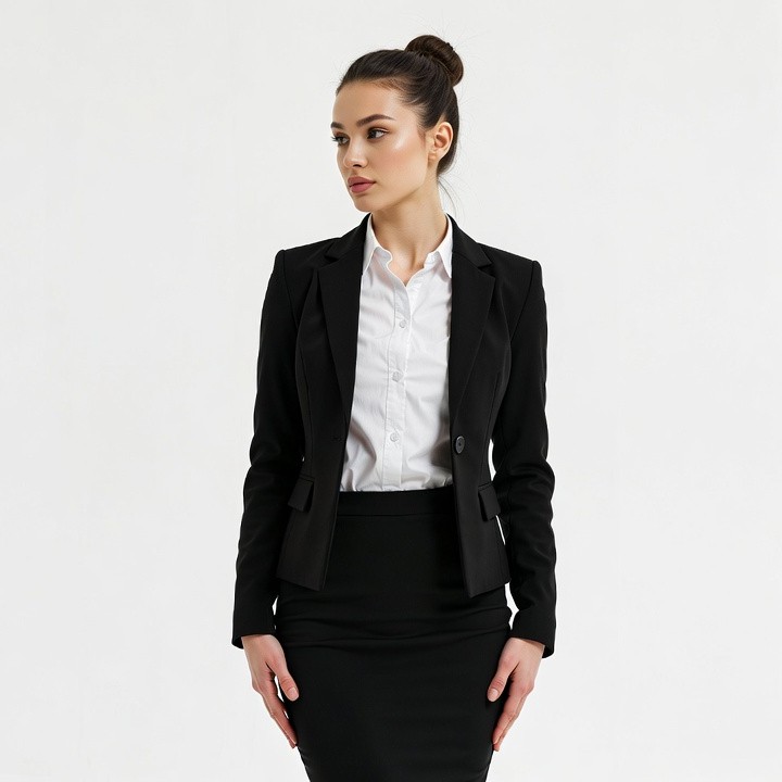 A young woman with dark hair in a bun wears a black blazer, white collared shirt, and matching pencil skirt. She stands with hands clasped in front, looking slightly to the side against a plain white background. Her professional attire features a fitted jacket with buttons and slim skirt.