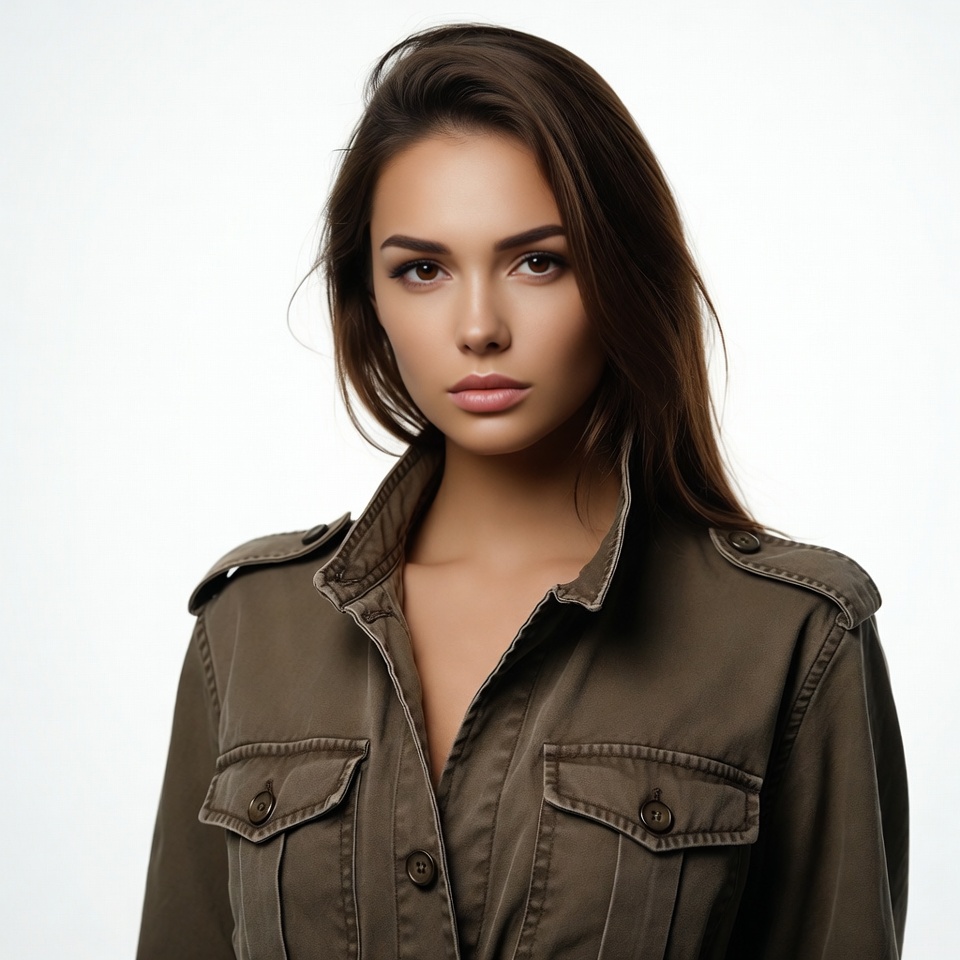 A young woman with long brown hair gazes directly at the camera against a white background. She wears an open olive green jacket with epaulets and buttons, revealing a slight glimpse of cleavage. Her expression is neutral with full lips and defined eyebrows.