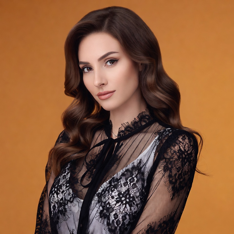 A woman with long wavy brown hair poses against an orange background. She wears a sheer black lace dress with a bow tie and lace details on the sleeves. Her expression is calm with subtle makeup and pink lips.