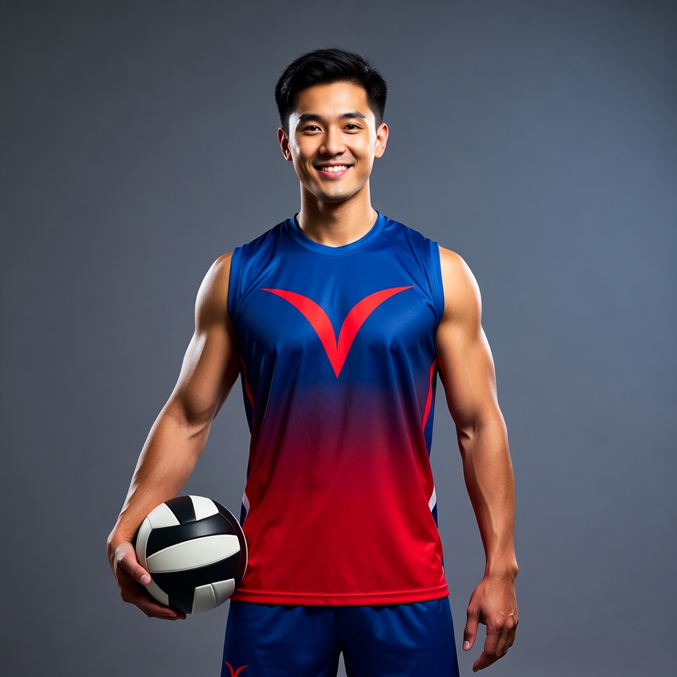 A young Asian man with short black hair smiles while holding a volleyball in his right hand. He wears a blue and red gradient sleeveless volleyball jersey and matching shorts, showcasing muscular arms. He stands against a plain gray background.