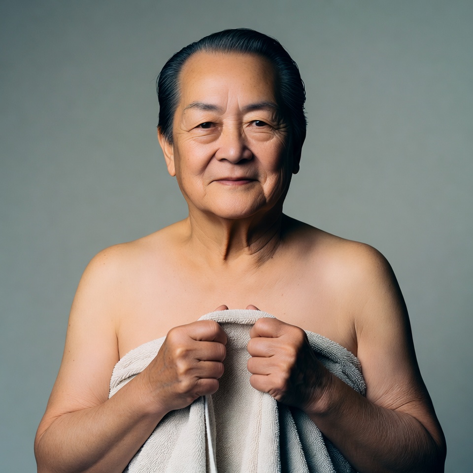 An elderly Asian man with short dark hair stands against a gray background, holding a white towel in front of his bare chest. He has a gentle smile and looks directly at the camera. His skin shows age lines, and his arms are visible.