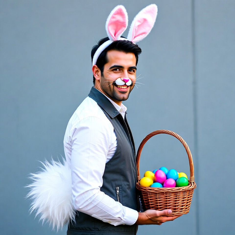 Easter basket, Easter bunny, Easter eggs, Middle Eastern, basket, bunny costume, bunny ears, bunny nose, bunny tail, colorful eggs, costume, dark hair, eggs, fluffy tail, gray background, gray vest, holiday costume, isolated background, male, mustache, pink ears, smiling man, white shirt, man