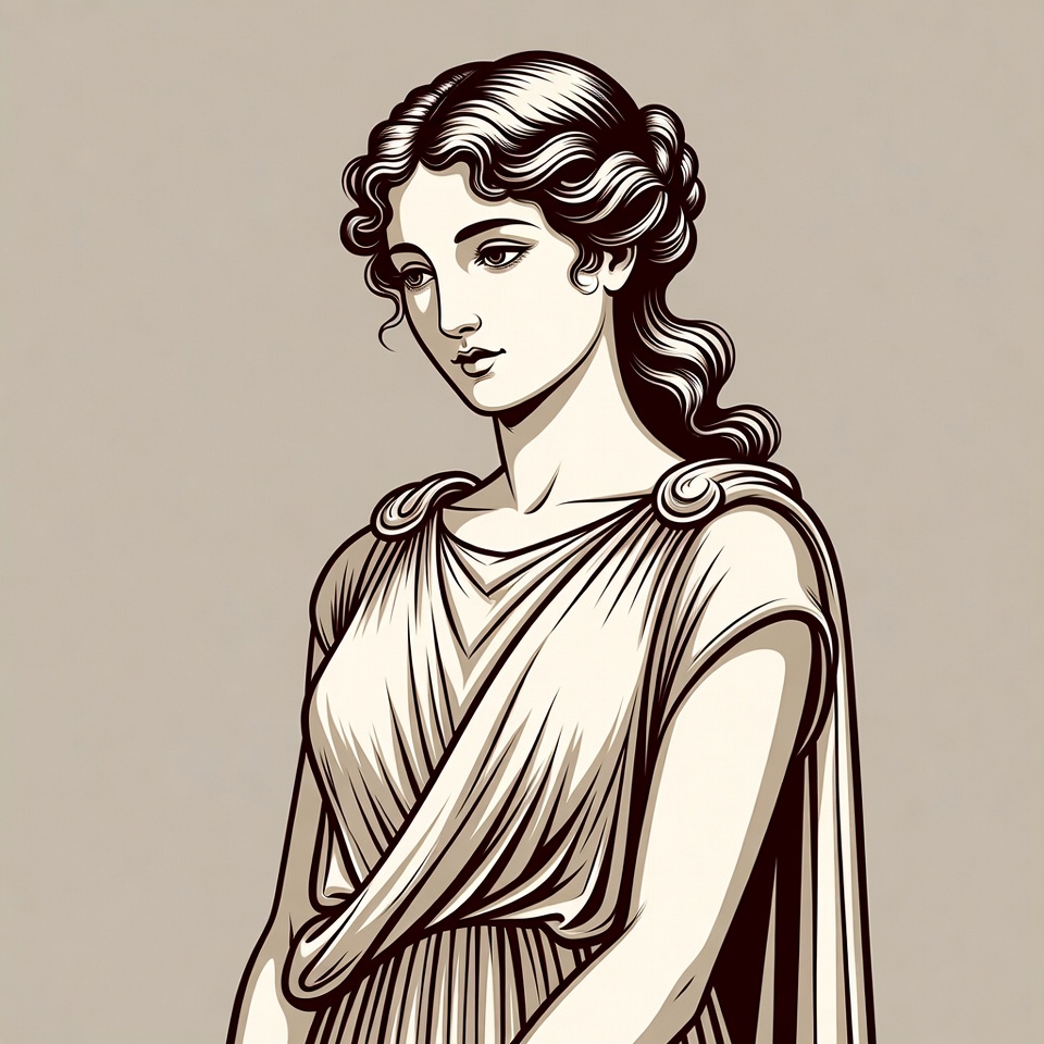A detailed line art illustration of a woman with wavy hair styled in an updo, wearing a classical white toga draped over one shoulder. She stands in a three-quarter view with a serene expression, her garment featuring intricate folds and decorative scrolls. The artwork is rendered in black and white on a beige background.