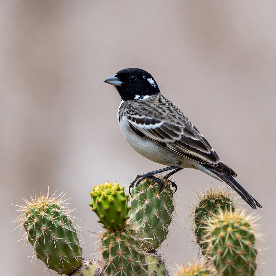 A black-headed grosbeak bird perches on a spiny cactus with yellow-green pads and flowers. The bird features a striking black head, white eye stripe, grayish-brown streaked body, and white underparts. It stands against a blurred natural background.
