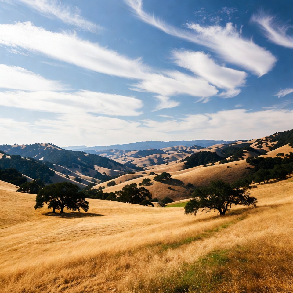 aerial view, blue sky, california hills, dry hills, fields, foliage, golden grass, grassland, hills, horizon, landscape, mountain ridges, nature, oak trees, outdoors, picturesque, rural landscape, scattered clouds, scenery, sunny day, terrain, trees, valley, vast landscape, white clouds, wilderness, yellow grass, rolling hills