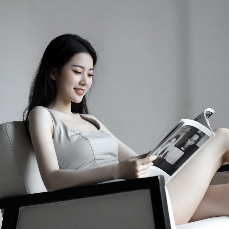A young Asian woman with long black hair sits on a white chair, reading a book with a man's photo on the cover. She wears a sleeveless gray tank top and has her legs crossed casually. The setting features a plain light background.