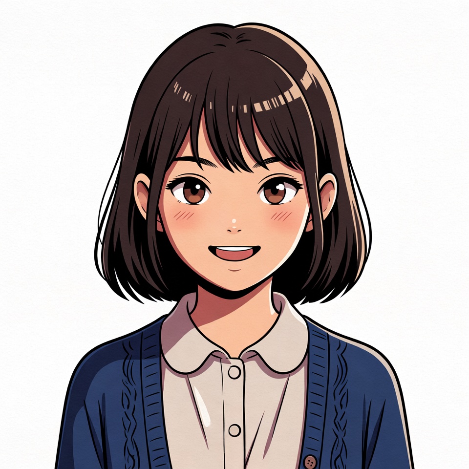 A cute anime girl with short brown hair and large brown eyes smiles happily. She wears a navy blue cardigan over a white collared shirt. The illustration features her on a plain white background.
